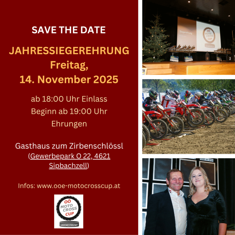 Am Freitag, den 14. November 2025, findet die Jahressiegerehrung des OÖ Motocross Cups im Gasthaus zum Zirbenschlössl (Gewerbepark O 22, 4621 Sipbachzell) statt.