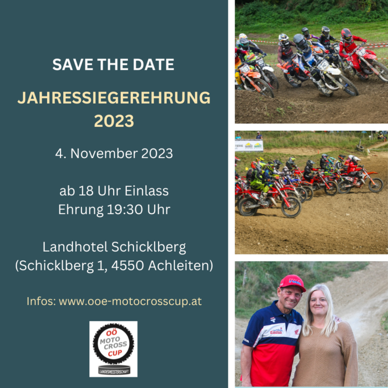 Die große Jahressiegerehrung zum OÖ Motocross Cup Jahr 2023 findet am Samstag, dem 4. November 2023 im Landhotel Schicklberg, in 4550 Achleiten statt.